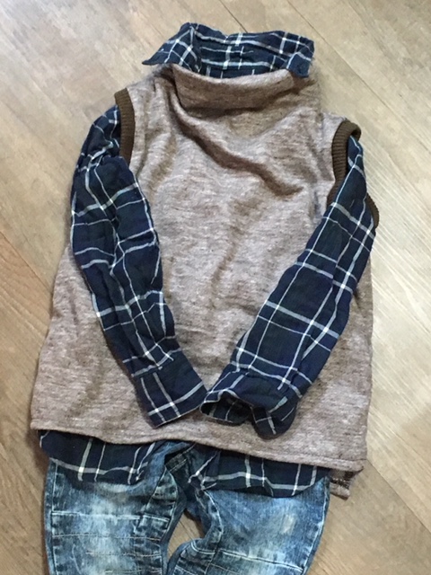 ブラウンのリブをあわせて、ボトルネックベストを作りました。