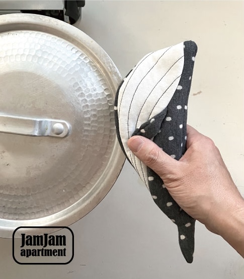 こちらは、jamjamらしくクジラをモチーフにデザインした二つ折りの鍋つかみです。