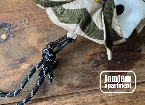 頭の上にはタブ1つ。足は市販の丸紐を活用し、リングやカラビナと絡める仕様。