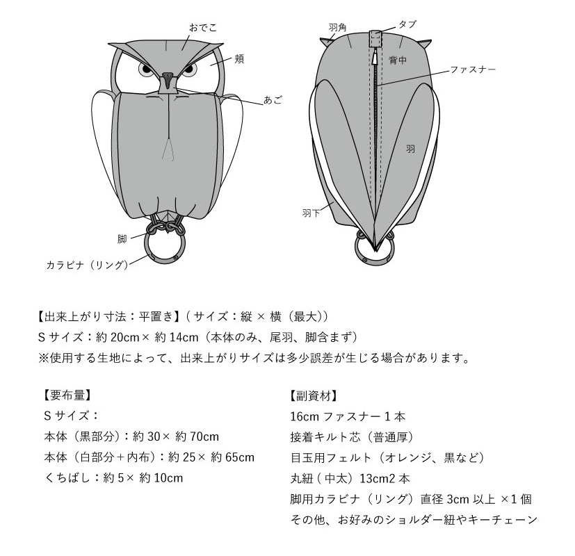 ※ 本体には、キルト芯を貼っていますが、羽角・まぶた・内布・羽片面には芯は貼っていません。